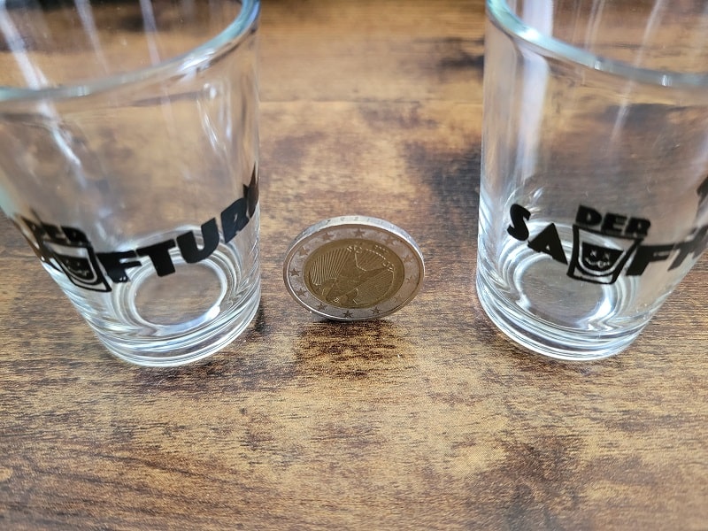 Fällt die Münze vom Tisch oder hört auf sich zu drehen, muss man die beiden Shots leeren und im Anschluss von vorne beginnen.