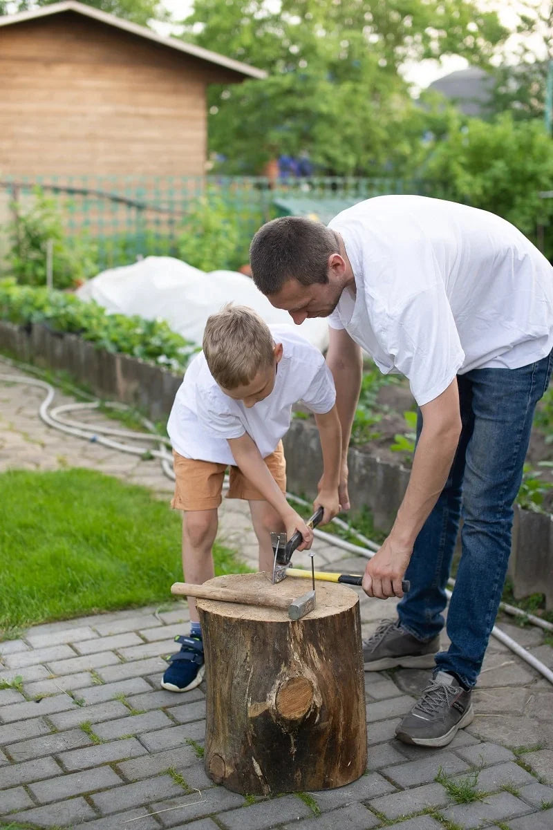 Wichtiger als ein harter Treffer ist, dass du vor allem zu Beginn den Nagel senkrecht in den Baumstamm schlägst. Wird er krumm eingeschlagen, erhöht das den Widerstand und du wirst nur noch schwer vorankommen.